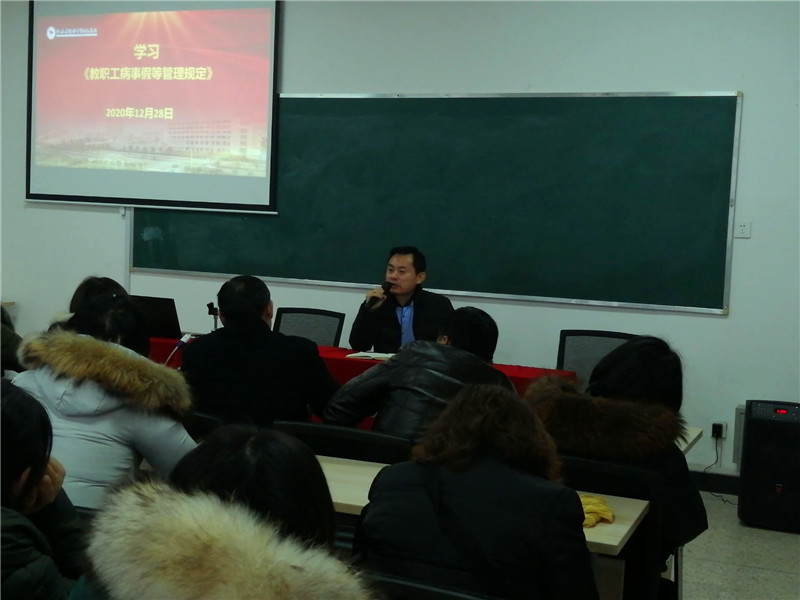 会议第一阶段最后,胡主任就学校近期几项涉及到全体教师切身利益的举措做出了说明,一是自2021年1月1日起,为全体早晚自习坐班老师提供免费就餐券;二是自2021年1月1日起,按规定调整出差补助;三是学校鼓励教师参加各级各类技能大赛、教学大赛,并出台了一系列的奖励措施;四是学校要求教研组一半以上成员开设校级公开课;五是学校将在1月15日以前完成对教师个人及各系部的考核;六是带领大家共同学习了《教职工病事假等管理规定》。