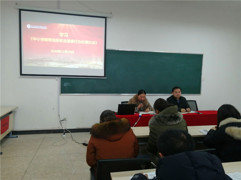 首先,胡主任介绍了会议议程并提出了政治学习纪律要求;接着,杨义兰副主任带领大家共同学习了江苏省《中小学教师违反职业道德行为处理办法》实施细则(试行)共七章23条。