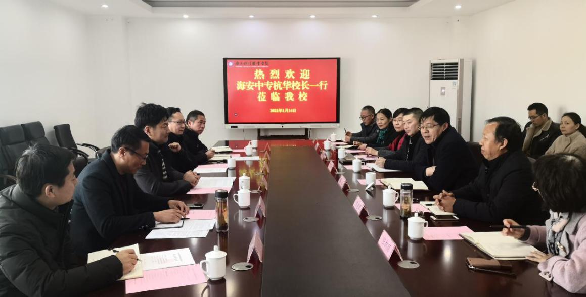 2021年1月14日,海安市教体局党组副书记、海安中专党委书记、校长杭华,党委委员、副校长徐培根,校务委员、教务处主任王军等一行6人赴南通科技职业学院洽谈合作办学事宜。南通科技职业学院党委副书记、校长方季红,党委委员、副校长周昶,教务处处长陈建军、招就处处长丁建华等参与了接洽活动。