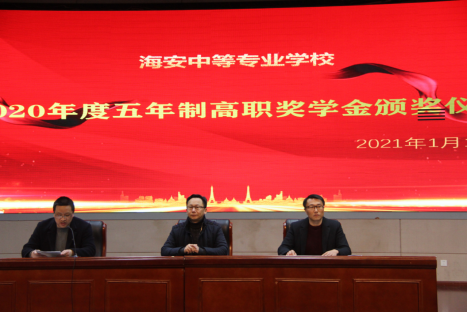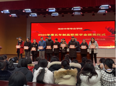 1月14日下午,海安中专办学点在图文信息大楼二楼报告厅举行2020年度五年制高职奖学金颁发仪式。学校党委委员、副校长徐培根,校务委员、教务处(高职处)主任王军,所有获奖学生及五年制大专一年级、二年级学生和班主任参加了本次颁奖仪式。活动由教务处(高职处)副主任周海青主持。