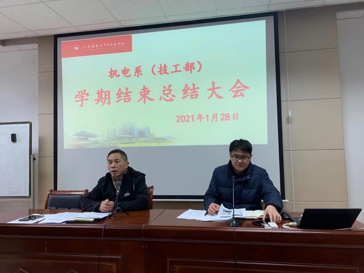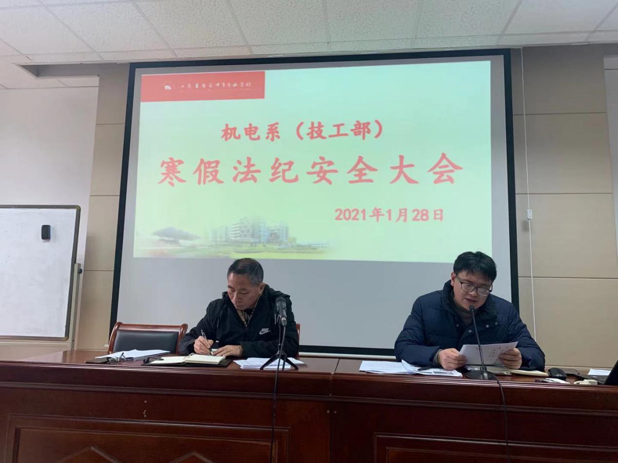 1月28日上午9点,机电系(技工部)在图文信息大楼109室召开了学期总结大会暨寒假法纪安全大会,会议由系部政工主任陈雪峰主持,全体教职工参加。