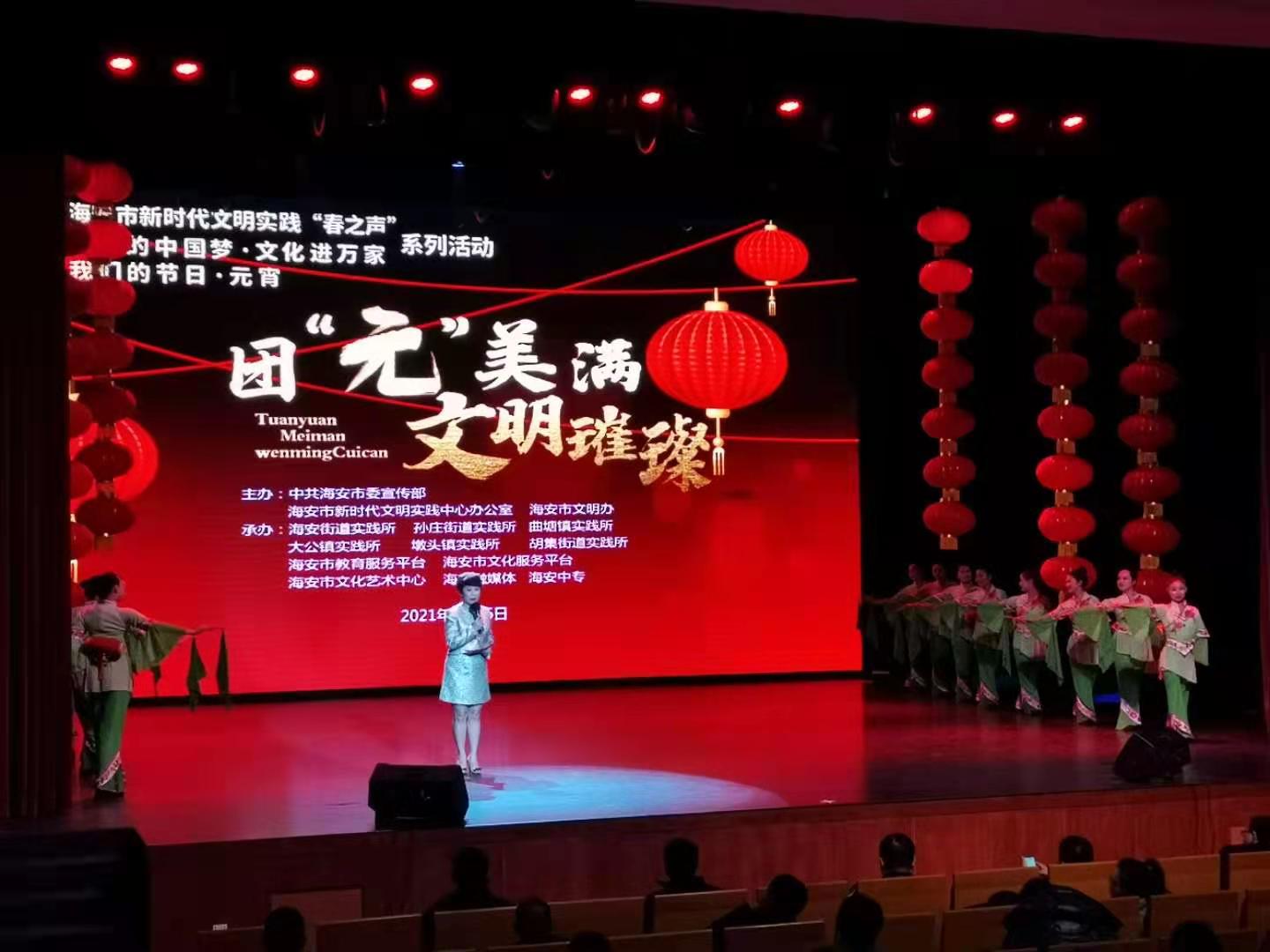 2021年2月26日,是正月十五元宵佳节,受市委宣传部邀请,海安中专参与由海安市委宣传部主办的新时代文明实践“春之声”系列活动之“团‘元'美满,璀璨文明”汇演,来自艺术部18级、19级学前教育专业学生在学校精心组织安排下,充分准备、认真训练、表现优异,将江苏省非遗项目“海安花鼓”再次展现在海安人民面前。
