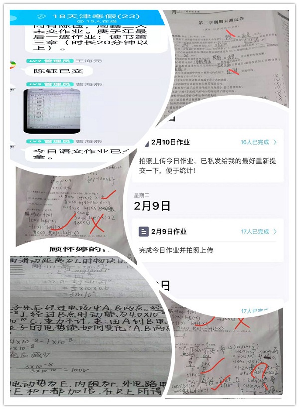 李海涛、陈艳兰、曹小兰等班主任统一学生假期作息时间,每晚九点后汇总学生作业完成情况,与家长交换意见。王香琴、刘爱玲、王海元等老师要求学生每天读背知识点,早上30分钟,晚上30分钟,并上传录音,然后完成笔试作业,他们逐一批改并点对点评析。吉拥琴、徐海燕、严丽华等老师每天检查批改学生作业,进行等级评价,附学习建议,鼓励学生刻苦学习。吴海雯、唐旭、刘文娟在线上组织学生进行大综合测试,及时阅卷评讲,要求学生整理错题。