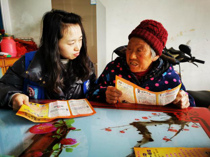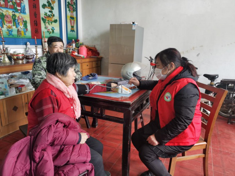 蒋庄村志愿者给老人免费测量血压并讲解高血压预防和合理的饮食搭配知识。志愿者还给社区老人宣讲“防诈骗知识”。
