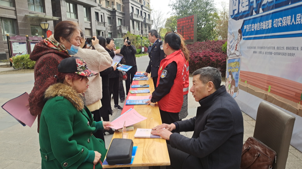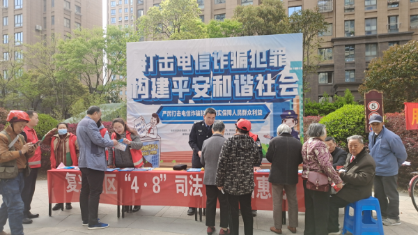 活动邀请社区民警胡跃圣、海安法律服务所法律顾问周玉和为大家送上紧贴群众需求的法律知识,现场以展板、宣讲、法律咨询、发放宣传资料等形式宣传电信网络诈骗法律法规、非法集资、民法典,通过理论联系实际,为来往的居民和需要法律咨询的需求者等带来了一场法治大餐。