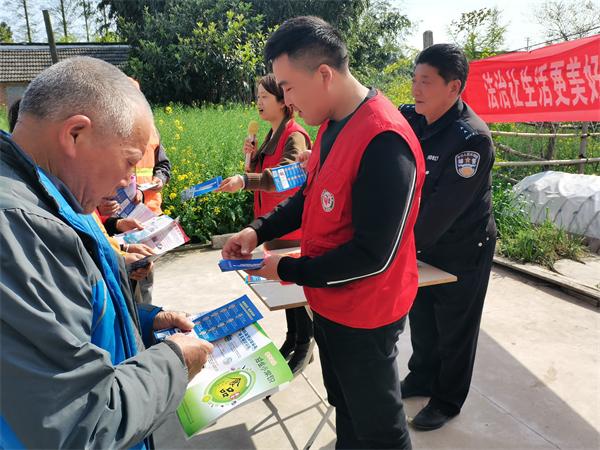 台下,志愿者张贴标语、分发法治宣传材料,用通俗易懂的语言讲述起法律、邪教、防诈骗等方面知识,解读群众普遍关心的身边事、重点事,提高群众依法维护自身权利的能力。