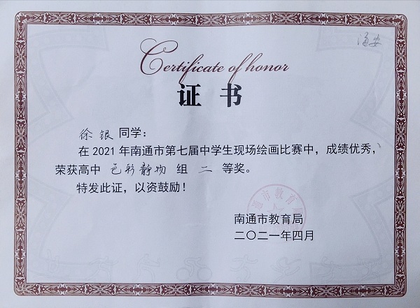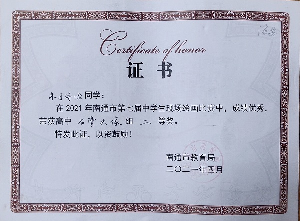 有效的指导,稳定的发挥,果然取得了喜人的成绩,徐银同学获得高中色彩静物组二等奖,朱于诗怡获得高中石膏头像组二等奖。
