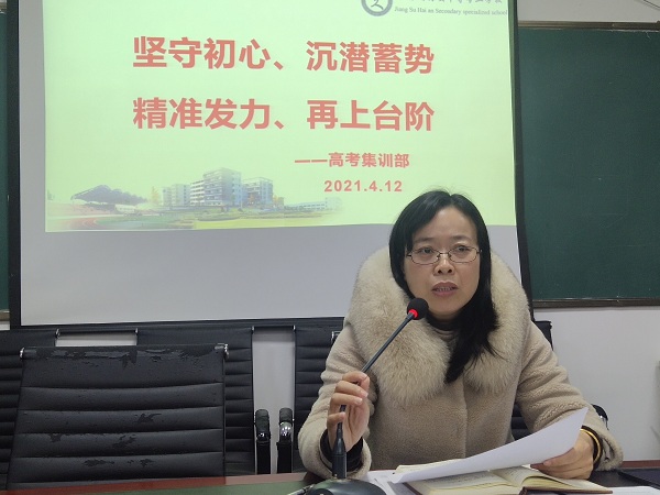 校务委员、高考集训部主任陆美莲同志针对南通市二模考试精准分析,她强调了高三年级最后十天的工作重点,数学和大综合两门学科是提分重点学科,高三任课老师要关注偏科学生的薄弱学科,依纲扣本、总结归纳、精心组织学生小题专练,错题重做,以考学考、提高考技。她要求高三班主任到班要勤,多与学生沟通交流,关注学生情绪变化,做好学生心理调节工作,重视班级高考环境和学风建设,帮助学生做好考具准备工作,并协助配合任课教师做好“二生”的个性补偿、提优补缺工作,尽心尽责陪学生到高考最后一分钟。