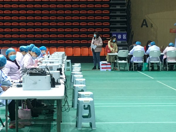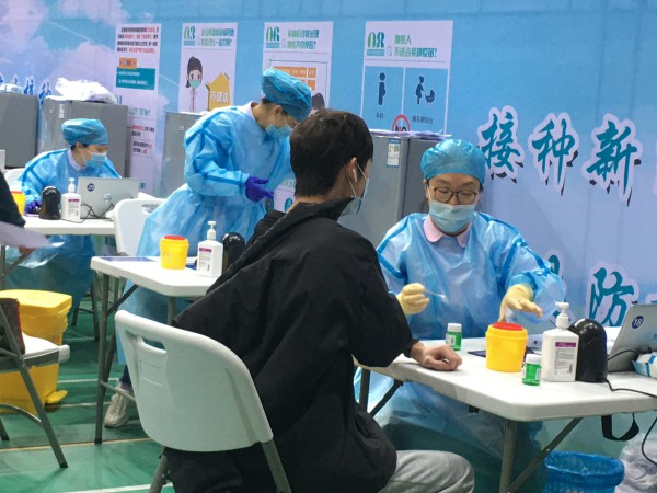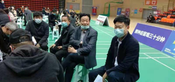 4月14日上午8点,海安中专师生们戴着口罩,排着整齐队伍来到市奥体中心体育馆,进入体育馆等候区填写表格、登记信息,到接种区处接种疫苗,接种后到留观区按要求留观30分钟。