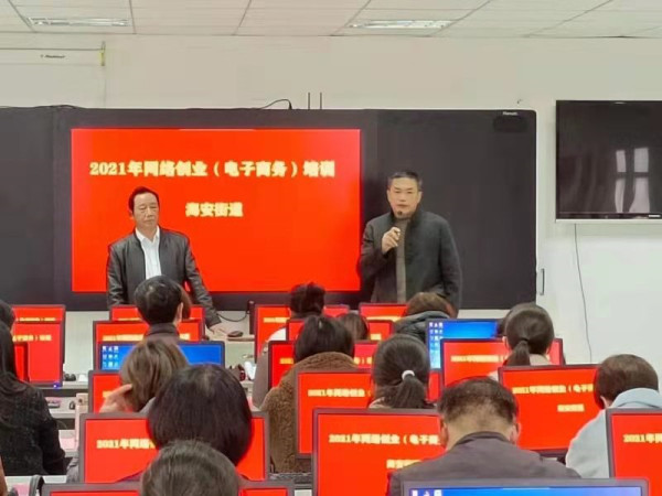 人社局就业处邰明慧主任、创业科张本建科长以及街道农社局陈松来纷纷发言。海安天淘职业培训学校负责人解维明对培训的流程以及意义做了详细讲解。培训从网上店铺的开店流程、开店规则、流量来源、促销方式、运营维护和数据工具的使用分析等六个方面展开。为了突出培训效果,培训将采取“手把手教、面对面讲”的方式进行,从而帮助培训人员尽快掌握网上开店、美图上传、店铺推广、直播带货等实操技能。