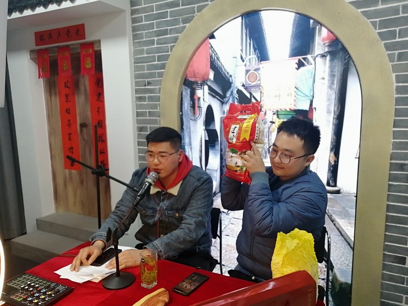 直播室内,杨庄村村干部濮军、顾史国化身主播,推销着麻虾酱。