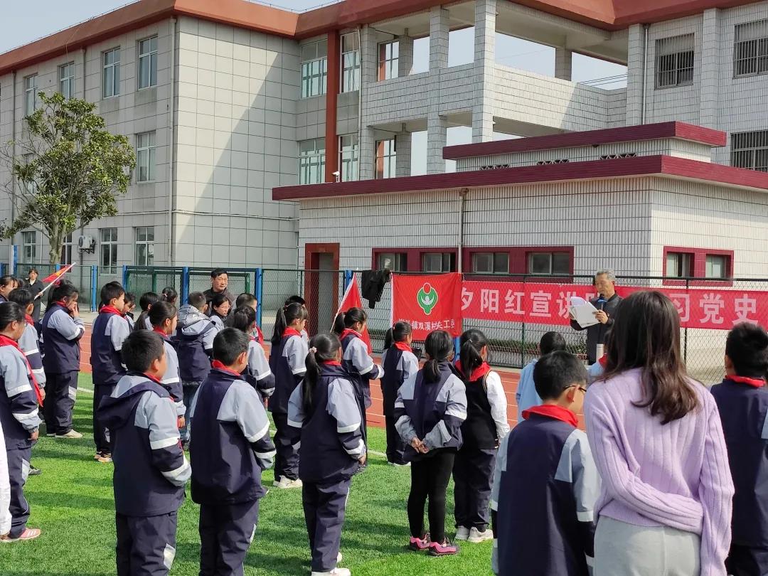 夕阳宣讲队成员退休老教师孙鸿舜进行宣讲,通过生动真实的革命故事,孩子和老师们感受良多,没有中国共产党就没有新中国,没有中国共产党就没有今天的一切。接着孙鸿舜就党旗、党徽、国旗、国徽及队旗队徽的标志意义为孩子们一一讲解,让孩子们有了更深刻的认识。此次活动的开展,让孩子们更深刻地了解了党的历史,更加热爱中国共产党,也感受到了作为一名光荣的少先队员的神圣使命,在学生心中埋下爱国主义的种子,进一步引导青少年做红色基因的传承者、实践者、弘扬者,成长为有理想、有本领、有担当的时代新人。