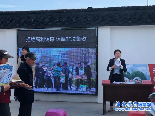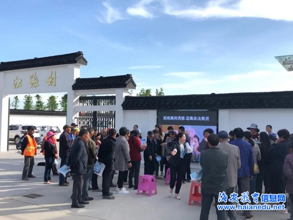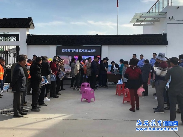 5月18日下午,角斜镇社区教育中心联合滨海新区司法所以“拒绝高利诱惑 远离非法集资”为主题在江海村居民学校开展防范非法集资宣传活动。