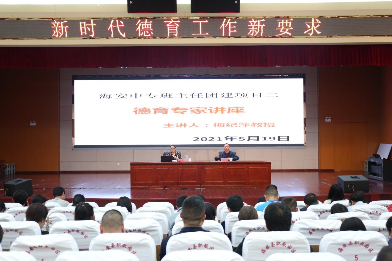 5月19日,为进一步加强学校班主任团队建设,提高班主任新时代德育工作水平,海安中专在图文信息大楼举行班主任培训活动,特邀江苏旅游职业学院党委副书记、江苏省德育工作委员会副主任梅纪萍教授来校为班主任作“新时代职业院校德育工作新要求”专题讲座。党委委员、副校长张兵主持培训活动,学生处、各系部政工干部以及全体班主任参加培训。