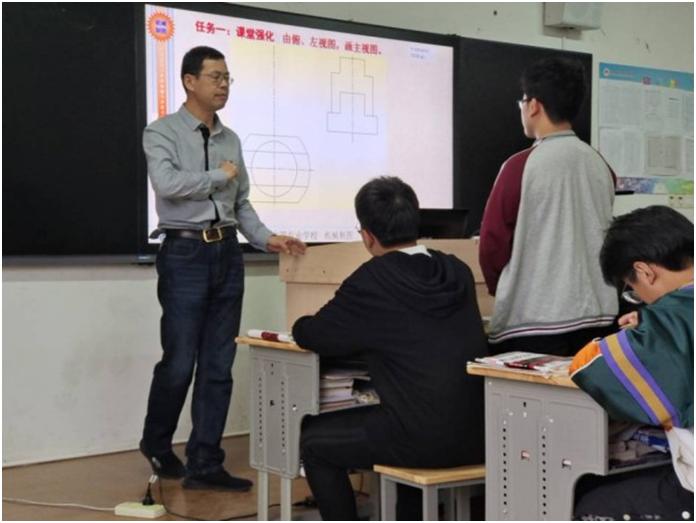 南通市骨干教师吴爱华开设了《读组合体视图》示范课。吴老师坚持积极教育理念,关注学生课堂积极体验,引导学生跳出平面投影中孤立图线,思考“体——面——投影”的关系,自我建构知识体系,培养正确的图学思维。