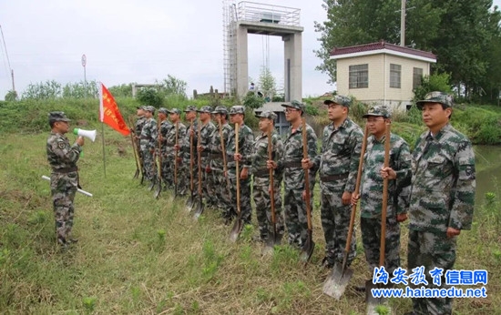 “同志们,现在已经进入了梅雨季节,洪涝随时都可能发生,抗洪排涝是确保人民生命财产安全的头等大事,我们应急分队将根据党委政府保大项目、保低洼田块,保重点区域的要求,进行全方位、多要素的演练。”白甸镇人武部长、抗洪排涝应急分队队长赵延民做了战前动员。