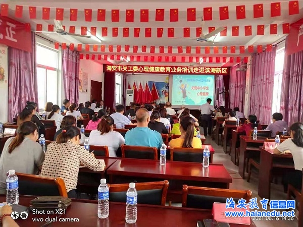 6月16日下午,滨海新区关工委和社区教育中心在五凌村会议室举办心理健康教育业务培训班。海安市心理协会副秘书长吴迎春为各村党总支副书记、关工干部、关工委常务副主任、团支部书记授课。