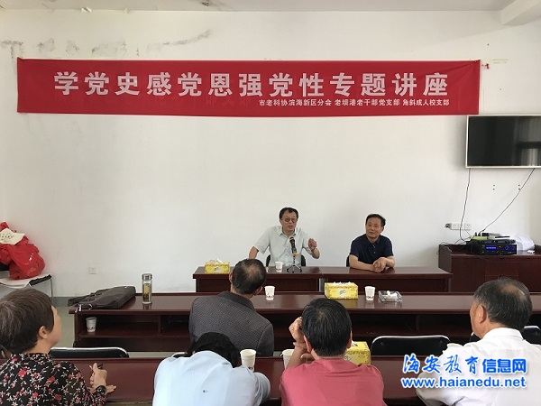 为进一步推动党史学习教育走深走实,6月19日,海安市老科协滨海新区分会、滨海新区老坝港老干部支部、角斜成人校支部联合组织开展“学党史 感党恩强党性”党史学习专题讲座,邀请海安市委党校原副校长、文联主席、全国知名的理论教育专家徐进主讲。
