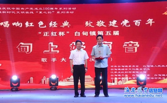 为庆祝中国共产党成立100周年,唱响红色经典、演绎红色文化、弘扬红色精神、激发广大人民群众爱党、爱国、爱社会主义、爱家乡的激情,6月19日,“正红杯”白甸镇第五届甸上好声音歌手大赛决赛在西泊旅游区广场隆重举行。本次活动由白甸镇党委、政府主办,白甸镇综合文化中心承办,江苏正红彩印有限公司、镇工会、镇农业农村社会事业局、镇社区教育中心协办。海安市文广旅局局长华志刚,副局长范小磊,白甸镇党委书记蒋增鹏,党委副书记、镇长陆枳彤,人大主席华留春及党政负责人、协办单位负责人出席活动。