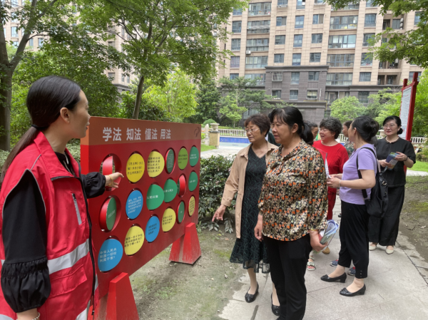 随后辖区居民参观法治游园,园内点缀有普法灯箱、普法长廊、普法地插、知识问答等,社区工作人员一一解说,让居民从法治游园中学习禁毒、反邪教、防范非法集资、网络诈骗等相关常识。“互动式法治教育”将法治理念潜移默化地嵌入广大居民心中,在辖区内形成良好的法治氛围。
