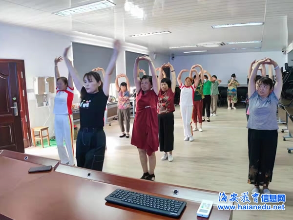 培训课上,指导老师首先就第六套“佳木斯快乐舞步健身操”的相关内容作了简单的介绍,随后开始授课,针对健身操的每一个动作要点,边解说,边示范,并为个别学员进行悉心指导。学员们热情高涨、学习认真、领会到位,一举手、一抬足都尽量做到规范整齐,在音乐的伴奏下,大家精神饱满、踏歌起舞。