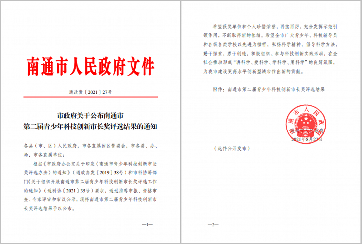 近日,南通市人民政府颁发《市政府关于公布南通市第二届青少年科技创新市长奖评选结果的通知》(通政发〔2021〕27号),我校师生和学校喜获三项大奖。