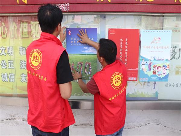 活动中,社区教育中心教师通过张贴宣传海报、发放宣传材料等方式积极营造推普工作氛围。结合各村居民学校读书交流活动和党史学习教育主题活动向广大居民介绍推广普通话和规范用字的意义及重要性,号召大家从自身做起,带动身边居民,一起来讲普通话,树立文明的城市形象,引导大家在日常生活中养成说普通话的习惯,自觉纠正各类不规范用字,积极营造“说普通话,写规范字,用文明语”的良好气氛围。