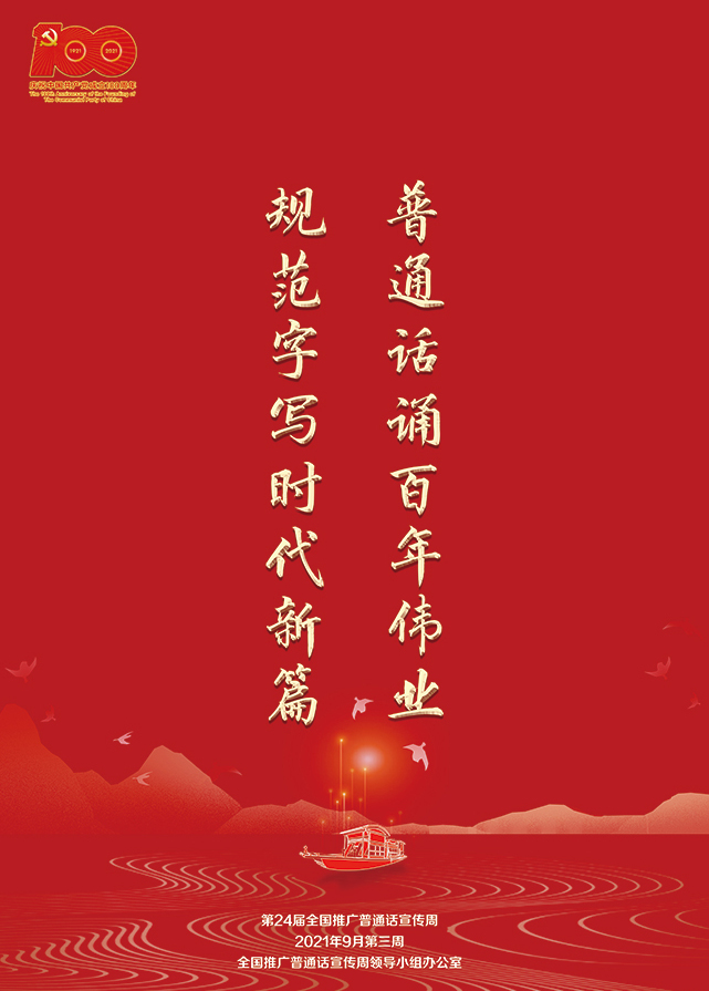 海报一:以“普通话诵百年伟业 规范字写时代新篇”为设计思路,背景为中共一大会址浙江嘉兴南湖,体现在党的坚强领导下语言文字事业百年光辉历程。
