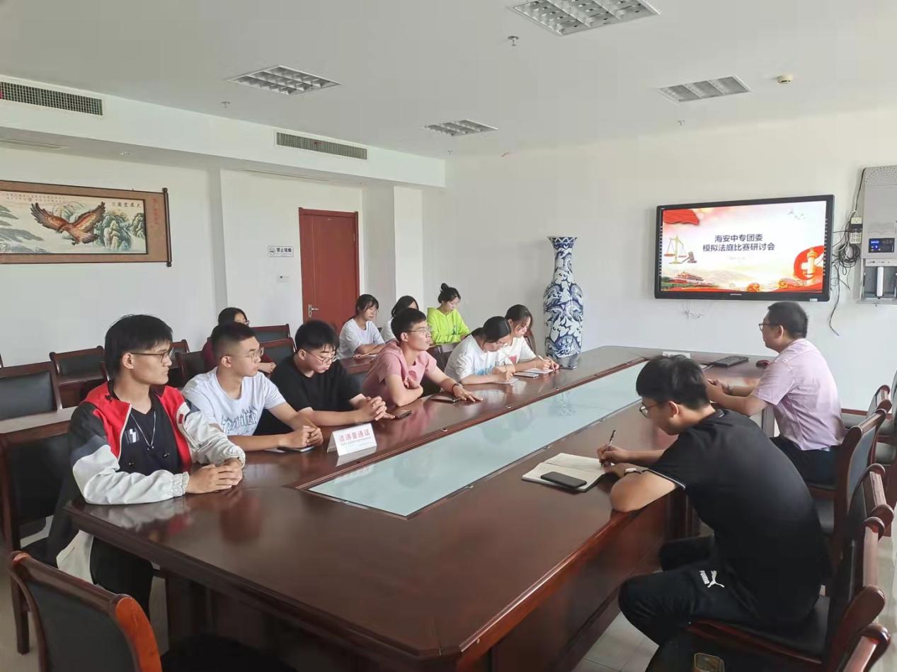 9月16日,海安中专团委在706会议室开展第五届南通市中等职业学校“模拟法庭大赛”研讨会。海安中专党群工作处主任、团委书记朱柳霖,团委副书记丁姜华及全体参赛选手参加会议。