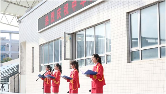 教师代表王晓莉老师发表热情演讲,表达海安中专老师们热爱祖国、赞美祖国的深厚感情。全校师生欣赏了艺术系同学带来的诗歌朗诵《国歌响起》,激情澎湃的朗诵抒发了同学们对伟大祖国的热情讴歌赞美之情。