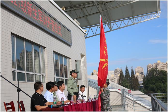 开营仪式上,夏鹏飞向2021级军训团授军旗。