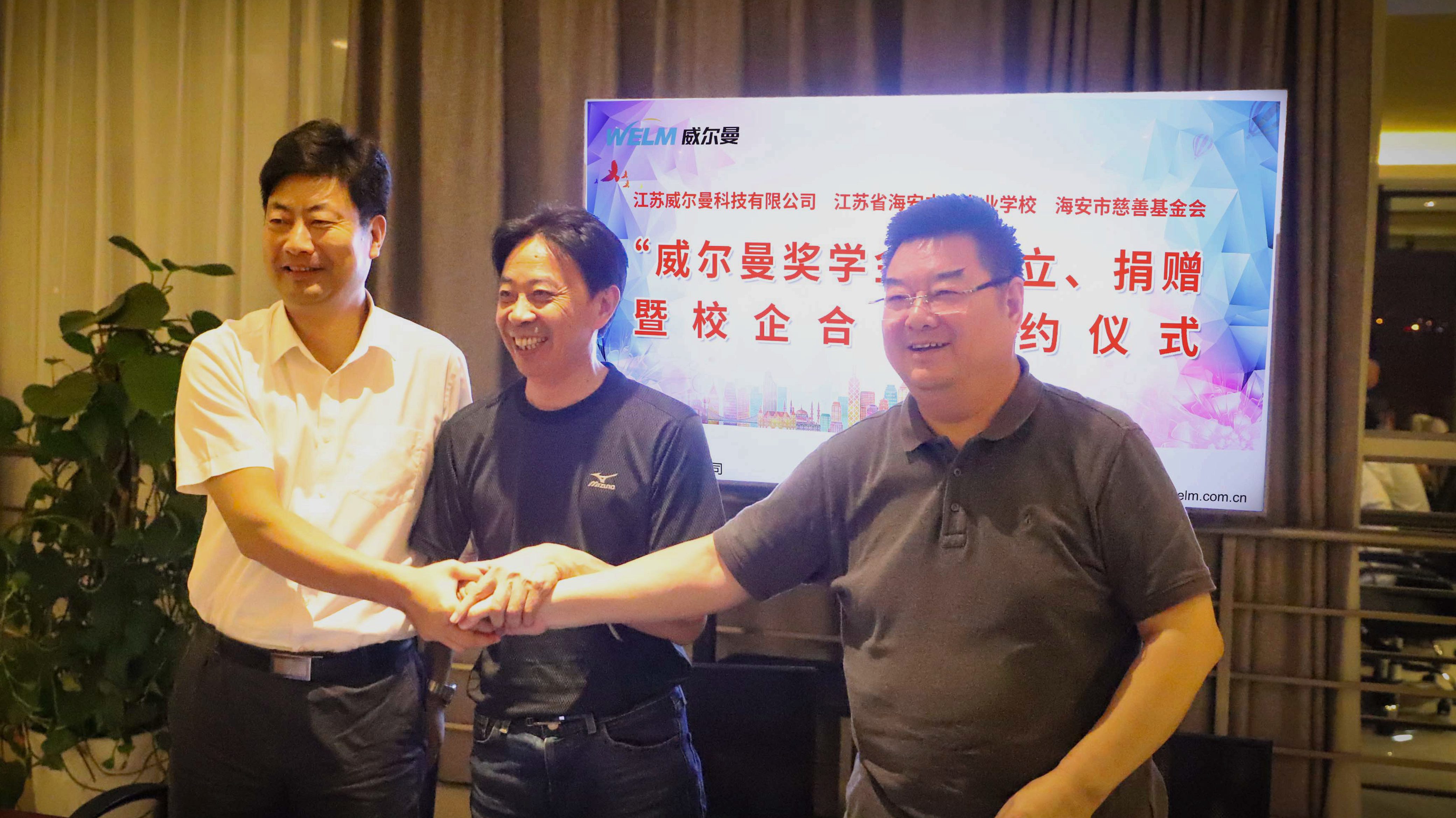 为弘扬中华传统美德,推动海安职教事业的发展,促进校企深度交流,激励职教学子奋发有为,江苏威尔曼科技有限公司决定捐赠50万元给海安市慈善基金会成立“威尔曼奖学金”,专项奖励海安中专优秀学子。11日下午“威尔曼奖学金”成立、捐赠签约仪式在威尔曼公司隆重举行。海安市慈善总会会长孙进基,江苏威尔曼科技有限公司董事长周经成,海安市教体局党组副书记、海安中专党委书记、校长杭华代表三方出席签约仪式。