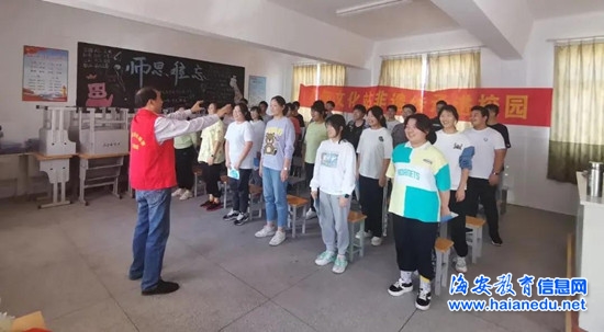 文化承载着灿烂的文明,是民族宝贵的遗产,保护非物质文化遗产功在当代,利在千秋。为弘扬传统文化,充分发挥中小学在非物质文化遗产教育和传承中的积极作用,让非遗物质文化遗产的精髓走进校园,真正让孩子们了解非遗、认识非遗、传承非遗,10月12日,白甸镇社区教育中心、白甸镇综合文化服务中心举办了“非遗文化进校园”主题活动。活动特别邀请海安白甸号子传承志愿者王宝文老师为瓦甸中学的孩子们传授海安白甸号子。