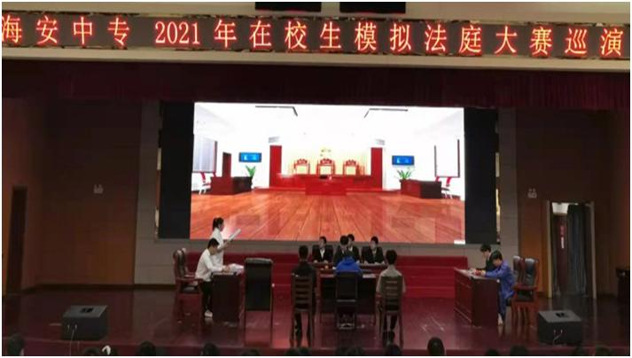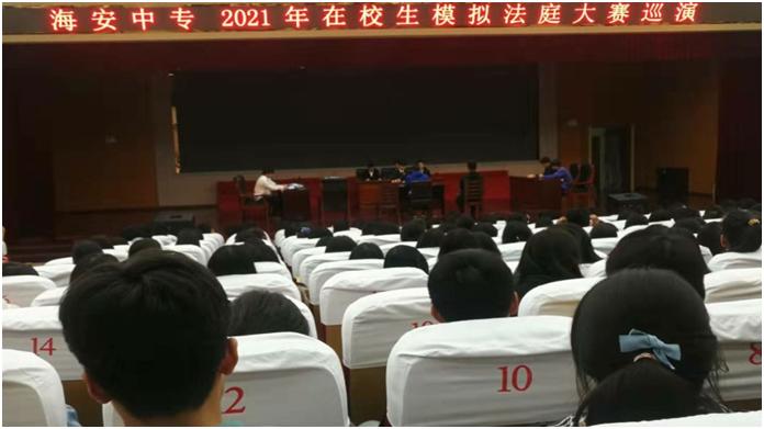 为进一步加强未成年人法治教育,增强青少年法治观念,10月19-20日,海安中专开展青少年模拟法庭体验观摩活动。学生处邹忠兰副主任主持活动,各专业系部政工主任、班主任出席活动。1000多名学生参加观摩活动。