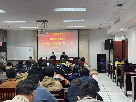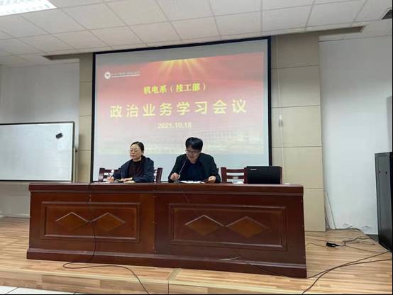 10月18日下午,机电系(技工部)根据学校的统一安排,在图文信息大楼109室召开政治业务学习会议。系部领导班子及全体教师参加活动,陈雪峰主任主持,学校党委委员、副校长唐素云出席并讲话。