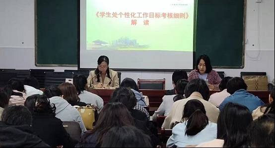 张主任解读了海安中专《学生处工作目标考核细则》和《安保处工作目标考核细则》以及《专业系部学生管理工作考核办法》,她要求集训部全体班主任增强团队意识,时刻敲响安全警钟,狠抓常规管理,及时开展各项活动,把每一次布置的工作的时效性发挥到最佳状态。