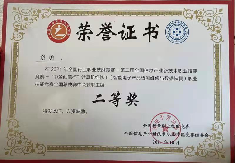 近日,2021年全国行业职业技能竞赛—第二届全国信息产业新技术职业技能竞赛—“中盈创信杯”计算机维修工(智能电子产品检测维修与数据恢复)职业技能竞赛全国总决赛成绩揭晓,章勇老师力挫群雄,荣获职工组二等奖。