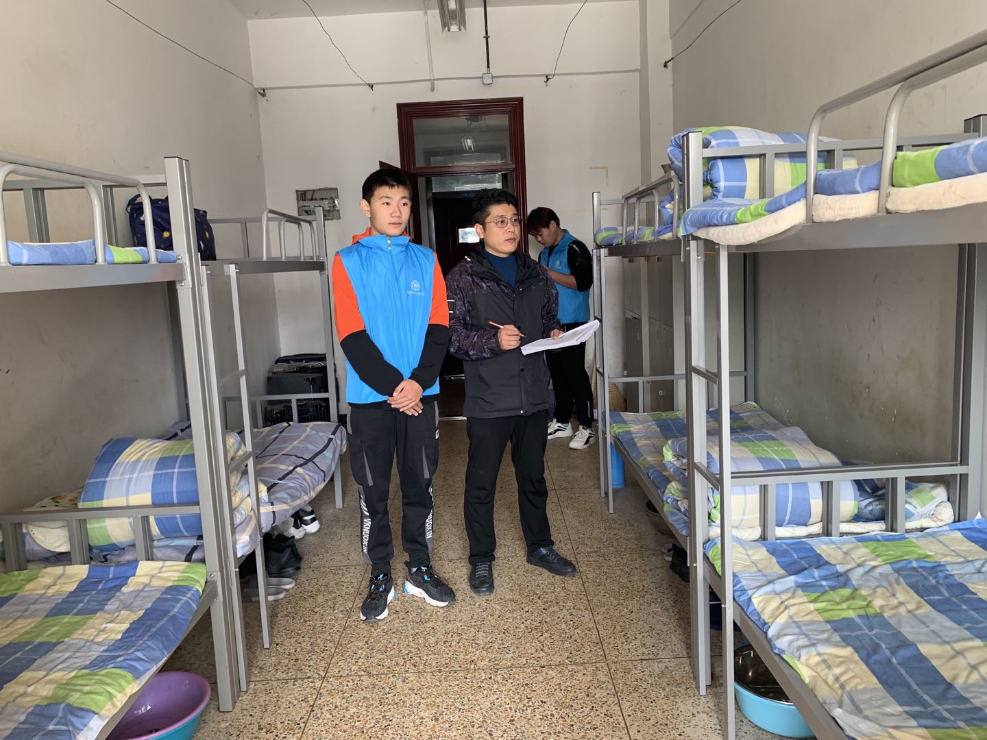 今天上午的评比活动共分为三个部分进行,第一部分巡查评分,张建伟带领大家对所有的学生宿舍进行了巡查评分。第二部分综合评奖,在完成巡查评分之后,对所有评比数据进行汇总,综合评选奖项,共产生了特等奖两名,一等奖三名,二等奖五名,三等奖十名,并且现场进行了奖品发放。第三部分,由我校一名退伍复学的伞降兵,刘苏瑶给外地学生做内务整理方面的指导和点评。