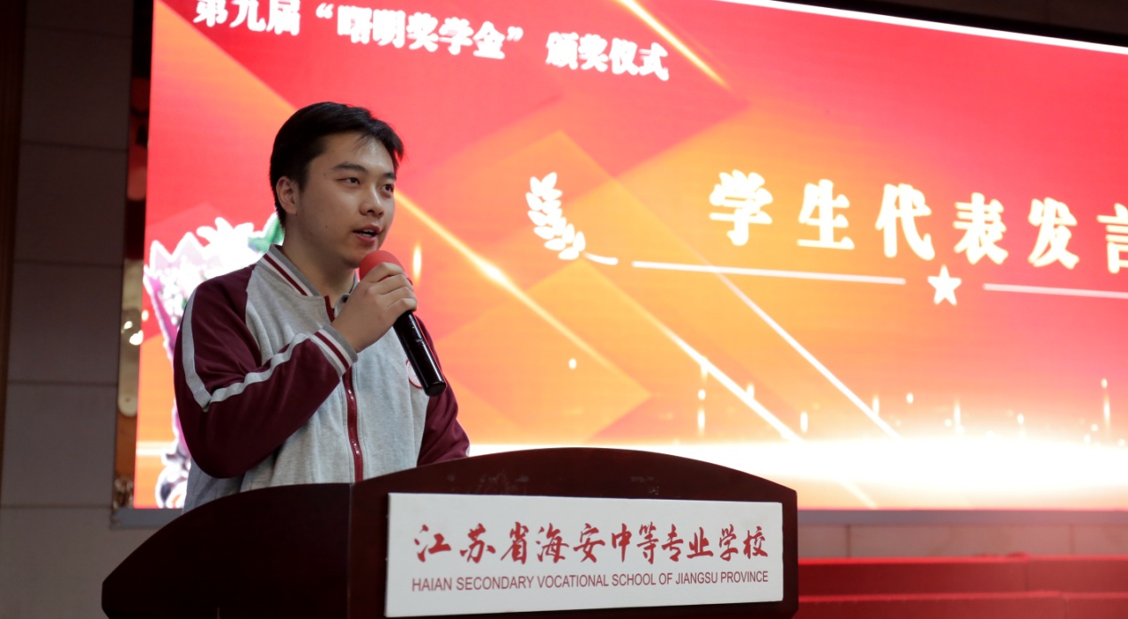 海安市教育体育局党组副书记、海安中专党委书记、校长杭华在致辞中介绍了赵教授非凡成就,对他心系母校,关心母校,关爱学生的义行善举表达了由衷的感谢,他要求获奖学生常怀感激之意,永葆进取之心,追逐人生梦想,争做大国工匠。