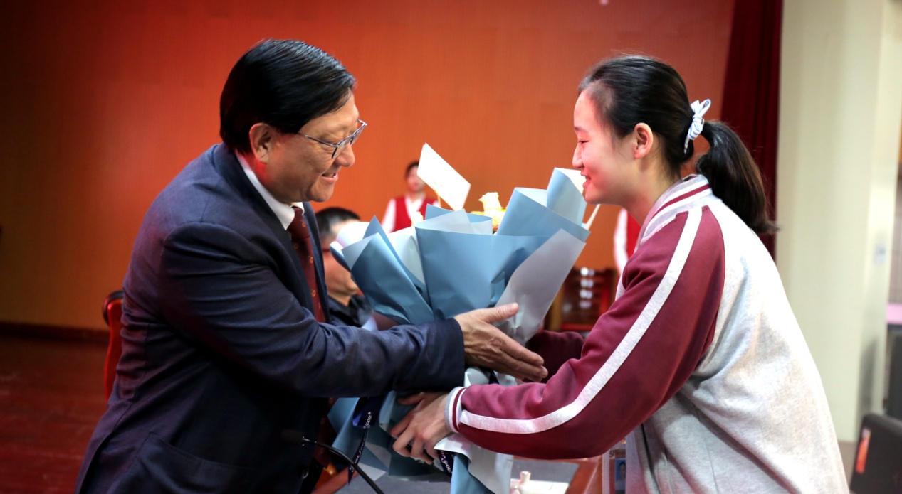 “品学兼优奖”第一名获得者丁玫妙同学向赵教授献上美丽的献花,代表全体同学表达了最诚挚的感谢,感恩之情溢于言表。