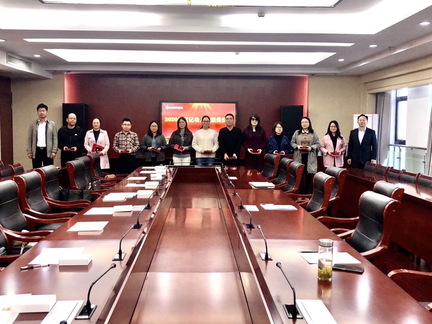 颁奖仪式上,市教体局党组副书记、海安中专党委书记、校长杭华,海安中专党委副书记、纪委书记徐培根共同为2020年度记功人员颁发证书和勋章,并合影留念。