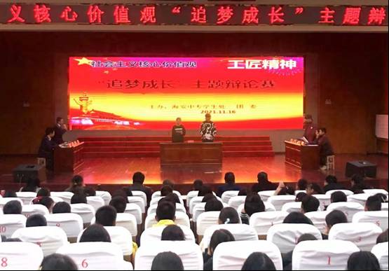 11月16日,为增强学生对工匠精神的理解,提高思辨能力,丰富校园文化生活,海安中专在图文信息大楼报告厅举办了“追梦成长,弘扬工匠精神”主题辩论赛,三组辩论队围绕辩题展开了激烈的辩论。本次活动由学生处、团委主办。