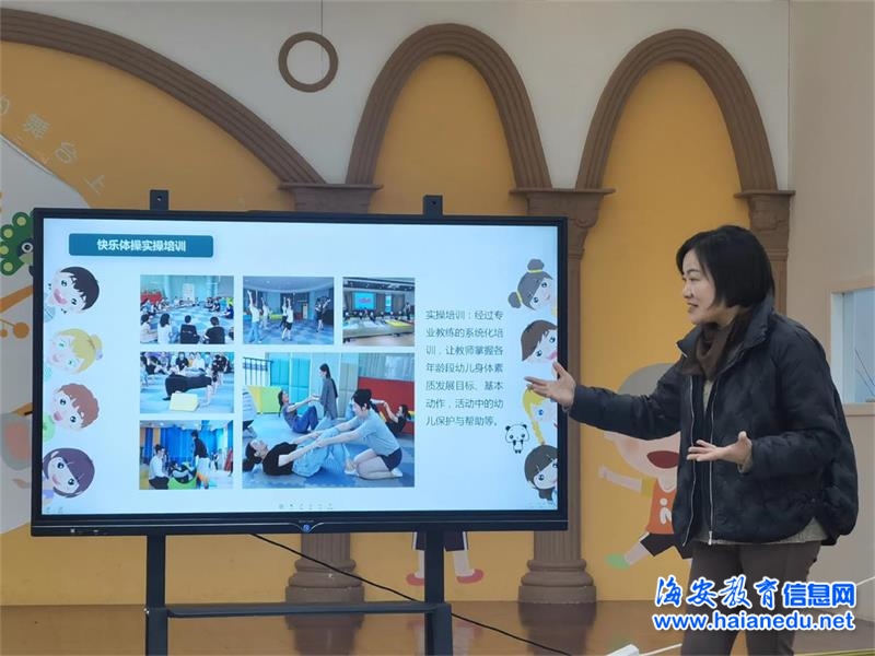 听讲座。曲塘镇中心幼儿园一直以来把快乐体操纳入健康教育课程体系,南通市学科带头、海安市曲塘镇中心幼儿园园长顾晓梅作了《走进幼儿园快乐体操》专题讲座,顾晓梅从快乐体操的背景概述、快乐体操的课程内容和快乐体操实施建议三方面与大家分享了快乐体操课程开展的实践与思考,并提出老师应该顺应儿童的需要和发展设置课程,这样才能给予幼儿真支持。