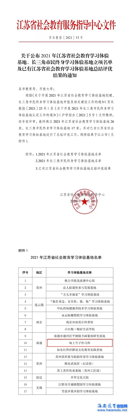 喜讯!“甸上号子传习所”成功入选! 文章来源:白甸成教 作者:白甸成教 发布时间:2021-12-22 浏览次数: 次 【字体:小 大】 在日前揭晓的《关于公布 2021 年江苏省社会教育学习体验基地、长三角市民终身学习体验基地立项名单及已有江苏省社会教育学习体验基地总结评优结果的通知 》白甸镇甸上号子传习所成功入选江苏省社会教育学习体验基地,此项荣誉南通市入选三家,海安市唯一。该基地的入选成为白甸镇非遗文化传承的重要阵地,进一步做靓了甸上号子的文化品牌,为党建和新时代文明实践活动拓展了空间。 分享到: 【打印正文】