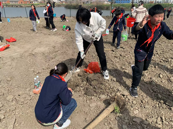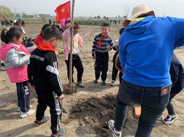 一眨眼的工夫,在大家的辛勤劳动下,一棵棵树苗便“亭亭玉立”在沃土上。虽然大家脚底全是泥土,但眼前这一片新生的春意让大家满心自豪和喜悦。