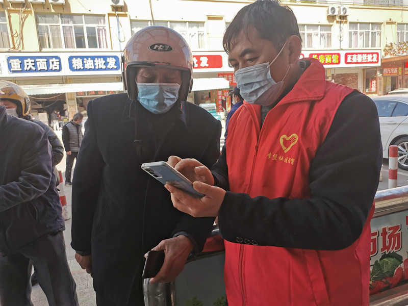 “健康码、行程码在哪儿呀?”市场门口,一位老人拿着手机焦急地问道。“别急, 我来教你!”。社区教育中心志愿者顾新华走到老人身边安抚道,他让老人打开手机微信,扫描二维码,一步一步地教他操作查验行程码。看到手机上出现的行程码,老人高兴地对检查人员说:“好了,我的行了!”