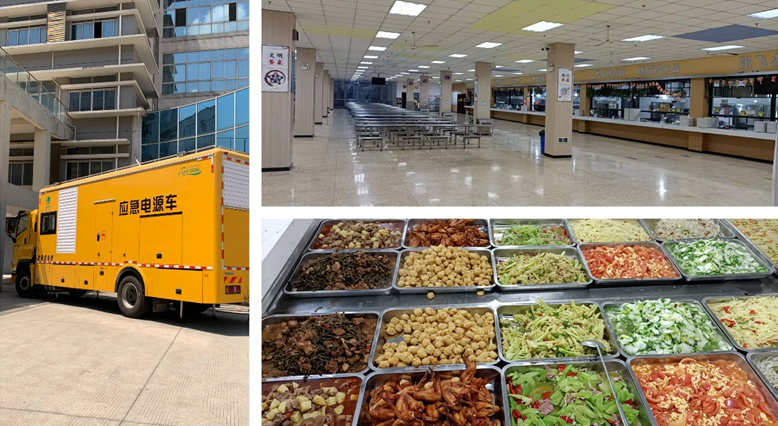 后勤处联系电力公司的应急电源车进驻考点,应急电源车与我校电网进行驳接并试运行,考生考试期间电力公司安排电力维保人员与我校后勤电工师傅们全程值守,保障考点、考场内的电力供应。