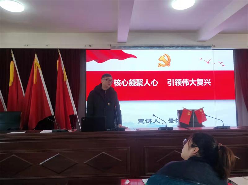 1月20日,学校“百灵鸟”宣讲骨干景怀荣来到周桥村,以《核心凝聚人心 引领伟大复兴》为主题,给全体党员和村干部作了一次微宣讲。景怀荣从“三个维度”来说“核心”,解读六中全会《决议》中关于“两个确立”的深刻内涵、精神实质。他从故事入手,以详实、生动的经典案例,围绕“从历史上看,核心关系党的前途命运;从现实来看,习近平总书记胜任核心;面向未来,实现伟大复兴需要核心”三个层面,帮助党员深刻理解我党确立习近平同志党中央的核心、全党的核心地位,确立习近平新时代中国特色社会主义思想的指导地位,反映了全党全军全国各族人民的共同心愿,对新时代党和国家事业发展、对推进中华民族伟大复兴历史进程具有决定性意义。